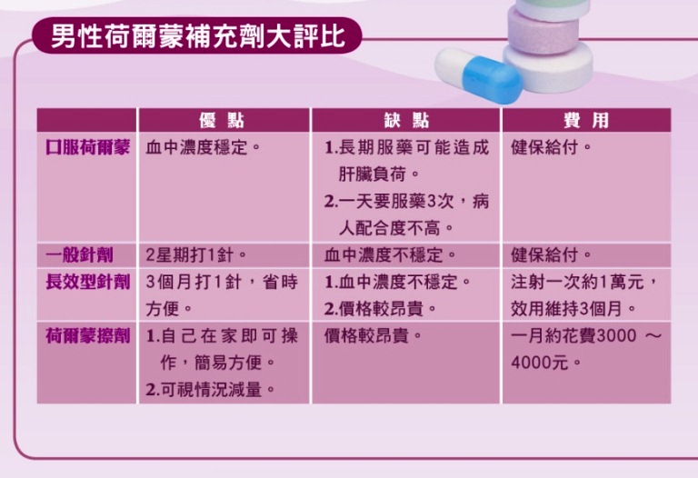 男性更年期是因睪固酮濃度偏低造成,因此,補充男性荷爾蒙是最有效的改善方法。目前健保給付的是口服藥、一般針劑等兩種;至於3個月長效型針劑或擦劑,須自費。蕭博仁提到,傳統療法是以服藥來補充男性荷爾蒙,缺點是效果不持久;再者,一天要服3次藥,病人配合度不高;且藥會經肝臟代謝,肝功能不好者須避免。