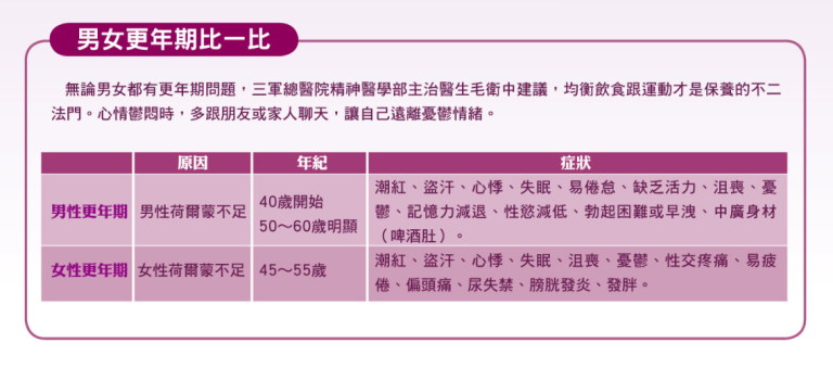 46歲的秉勳近來常為失眠所苦,半夜醒來就難以入眠,白天上班也一臉疲倦、提不起勁,而生活中稍不順心,便易焦躁或沮喪。在房事上,也顯得「性」趣缺缺。太太對他的轉變很不能理解,懷疑他有外遇,一再追問,他才吞吞吐吐的說,自己可能有性功能障礙的問題。為了證明自己沒說謊,夫妻倆一起到泌尿科檢查。醫師細心問診、抽血檢查後,告知秉勳可能邁入「男性更年期」。