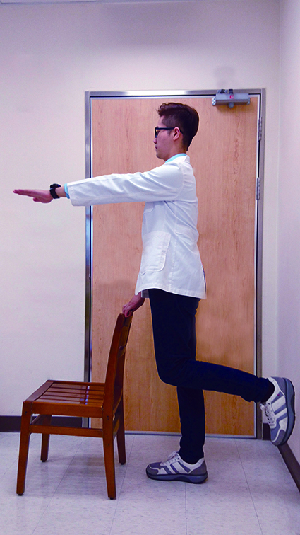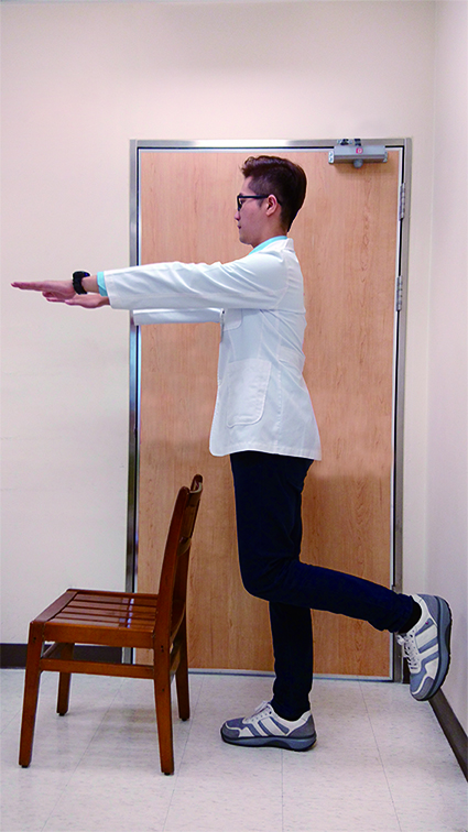 動作3:「單腳站+單手(或雙手)撐扶」停30秒~1分鐘,左右腳各做1次。