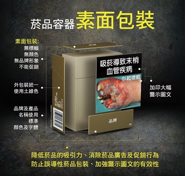 香港政府2017年將菸盒警圖面積從原先的50%加大至85%,現在則全力推動菸品素面包裝;澳門現實施菸盒警圖面積50%,目前正在推動加大至75%與素面包裝並進。其實臺灣早在2007年通過菸盒印製35%的警示圖文,當時為全球第21個實施,但因11年未修法加大警圖面積,2014年還把內容改得更溫和無感,現在全球排名與中國大陸同列第122名!