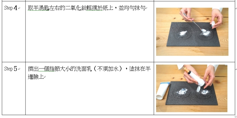 4. 長時間在臉上搓揉洗面乳,可能會造成臉部過度清潔、皮膚粗糙的情況,因此實驗操作以10秒左右的搓揉和沖洗時間為主,模擬洗面乳最佳的停留秒數。