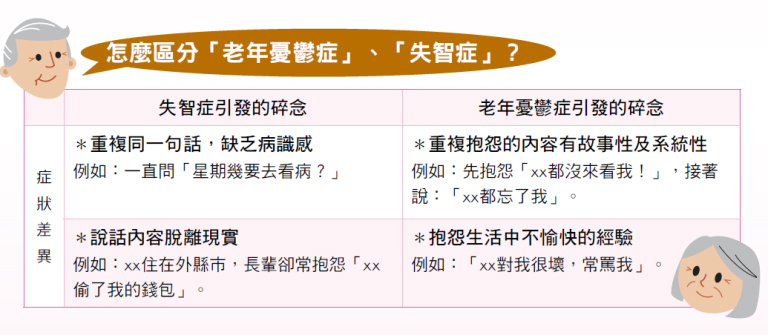不管是失智或憂鬱症,都可能出現常碎碎念或抱怨同一件事的情況。蔡佳芬醫師表示,失智跟記憶功能有關,因此碎碎念的用詞具重複性,例如:一直問「星期幾要去看病?」,而憂鬱症是對某件事或某個人「帶有負面情緒」,因此抱怨內容較有故事性或系統性,例如:先抱怨「xx都沒來看我!」,接著說:「xx都忘了我」。