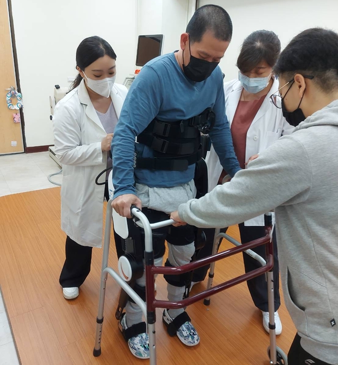 圖說:外骨骼機器人可偵測中風者肌肉、關節想要施力的訊號,幫助復健者完成動作。(圖/王建智醫生提供)