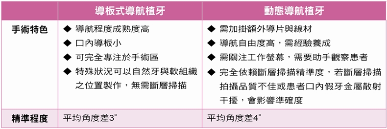 導引式植牙是利用額外設備幫助降低人為誤差,達到較佳的精準度。「導板式導航植牙」是在手術前藉由傳統模型與斷層掃描製作出手術安全導板,為植牙做好「軌道」;「動態導航植牙」是在手術時透過高精度斷層掃描的導航系統,直接在口腔內定位。兩者都有助於定位植體的植入空間、角度與深度,精準度高。