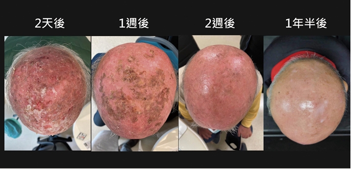 圖說:圖為多發性日光角化症伴隨部分區域癌化,經過一次光動力治療,過了2天、1週、2週、一年半後的結果。一般治療約需2或3次,但這位患者只接受過一次治療,通常治療完約2週~1個月後能恢復正常膚色。(圖╱台北榮總李政源醫師及張綜顯醫師提供)