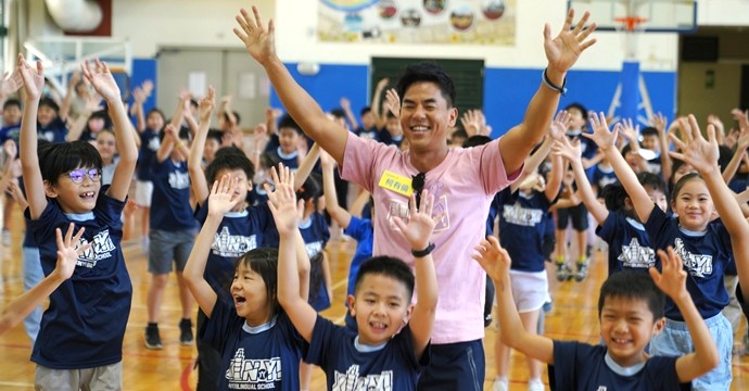 圖說推廣大使柯有倫與學生們體驗運動後帶來的快樂,一起用運動打造身心健康。