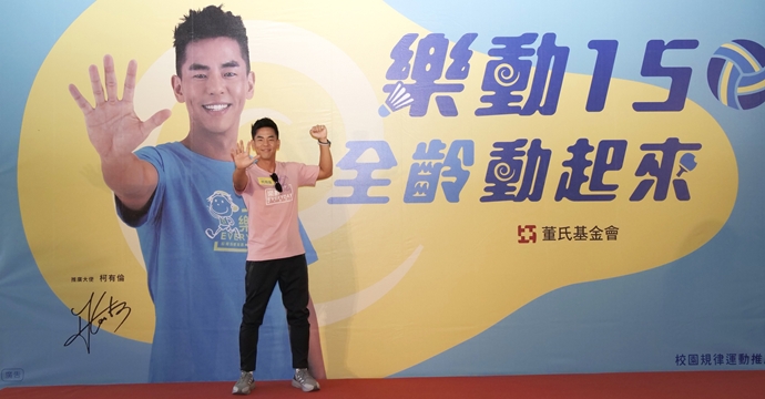 圖說推廣大使柯有倫出席運動部全民運動署與董氏基金會共同舉辦之「樂動150,全齡動起來」宣導記者會,現場與同學分享善用「運動三寶」保持身體活動量,從日常開始,一起動起來吧!