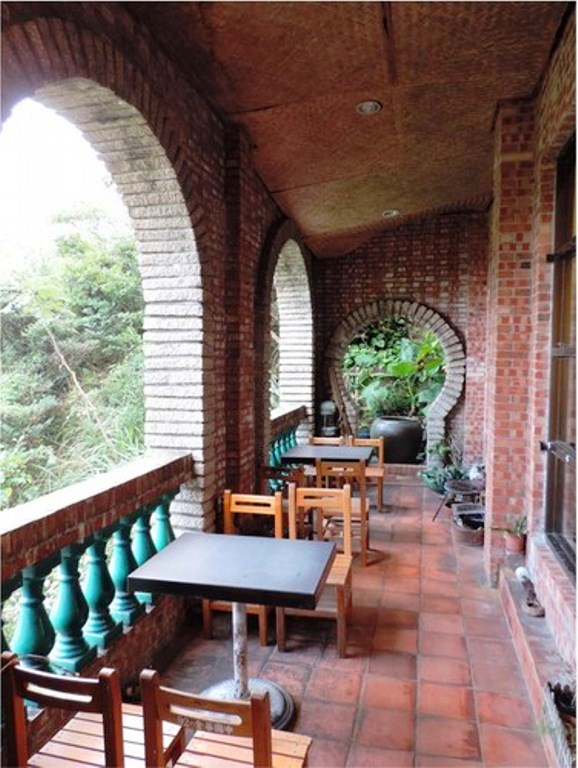 從水湳洞浪漫公路向九份方向開不到5分鐘,就可看到這幢造型吸人目光的紅色洋樓。紅磚外牆配上大片圓栱形窗櫺,綠色西洋花瓶和土色中國陶瓶所搭成的欄杆,彷彿回到了過去的時光。