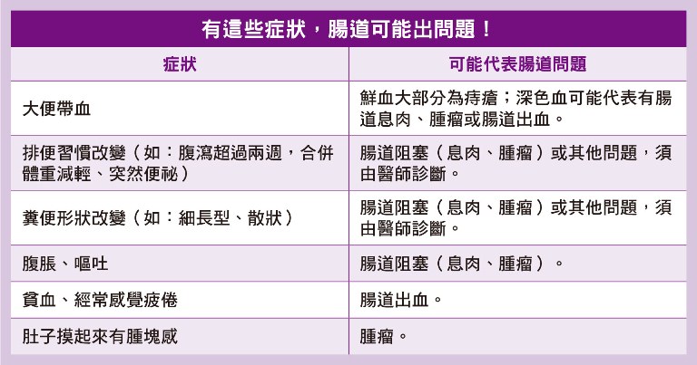 若大便突然變細長型、或突然出現解便困難、大便帶血的情況也要注意,可能是息肉或腫瘤導致腸道出血及阻塞。雖然臨床上大便帶血的情況,多是痔瘡破裂所致,但排除痔瘡問題,就可能是腸內有腫瘤、潰瘍或發炎,只要連續多天排便都帶血,或排出較深紅色的血及血塊,建議盡快找醫師檢查。 (延伸閱讀:及早發現大腸癌,4大篩檢法比一比)