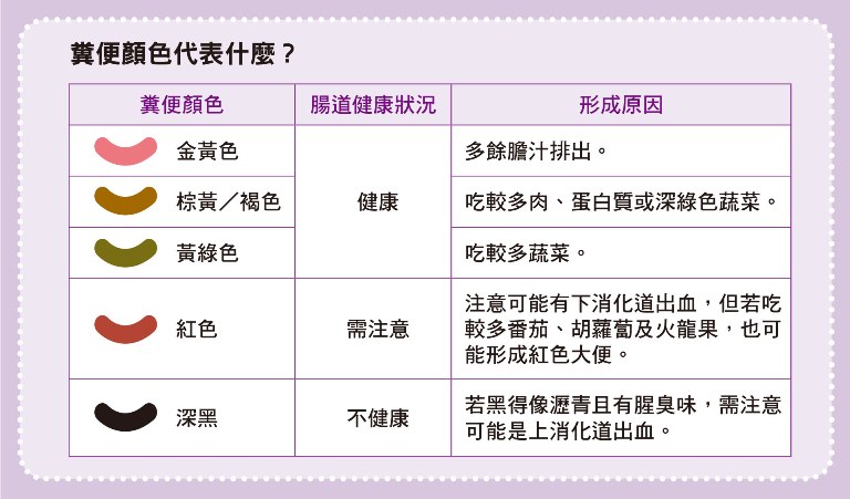 比較容易自我判斷腸道健康的方法,是觀察糞便外觀。邱展賢醫師提到,棕黃色到深黃色的香蕉狀大便是最健康的,有些人的糞便稍微深棕色,這不用太過緊張,通常綠色或深色蔬菜吃較多的人,糞便顏色會較深。若消化不良,可能會出現淺黃色,偶爾帶一些綠色的糞便,這可能是消化能力稍差,排出的膽汁較多,不用太過擔心。不過,倘若大便帶血變深、或大便顏色很淡,出現淡黃甚至白色,便需提高警覺。