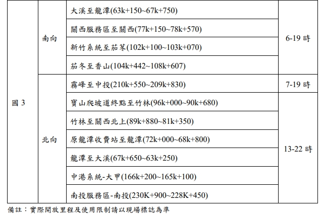 0至24時,封閉國1虎尾及埔鹽系統北上入口、國3竹南、烏日北上及名間雙向入口匝道。 | |