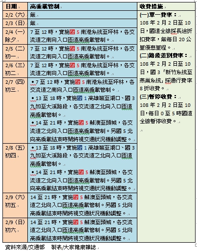 108年春節連假自2月2日(週六)至2月10日(初六)週日共9天,針對高速公路相關管制措施如下: