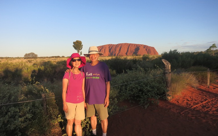 【圖說1】本書作者葉金川與夫人造訪位於澳洲中部愛麗絲泉附近的艾爾斯巨石,背景就是《在世界的中心呼喚愛》電影中,美麗又神祕的烏盧魯Uluru.