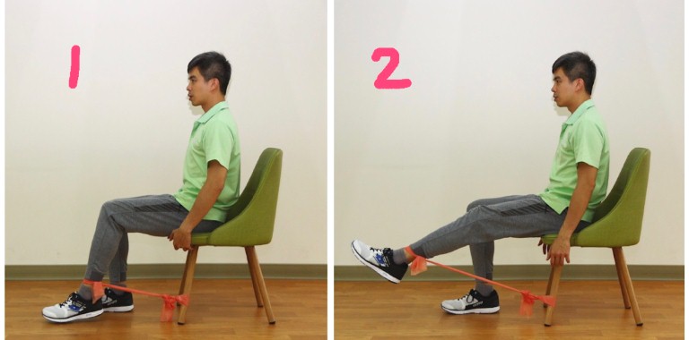1. (預備動作)將彈力帶綁在椅腳,另一端綁在腳踝上方。