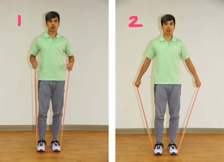 1. (預備動作)雙腳張開與肩同寬,自然將彈力帶抓著。