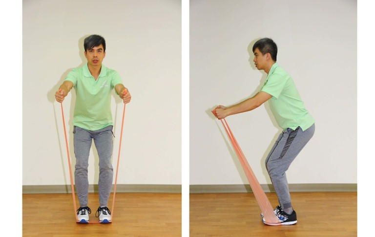 2. 將膝蓋伸直,可隨時調整彈力帶長度,以加強阻力。