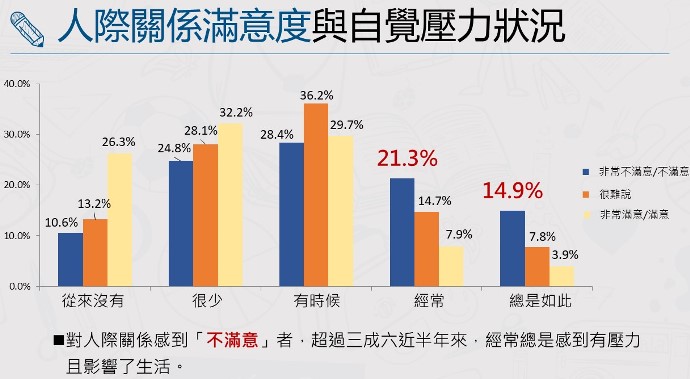 進一步分析發現,受訪者對於人際關係感到「不滿意」者,近半年常感受到壓力而影響自身生活者,占36.2%、「覺得自己很孤單」者占37.3%,以及最近一週情緒感到「有明顯憂鬱情緒,須主動尋求專業協助」者占30.2%,均明顯高於對人際關係感到非常滿意者。(延伸閱讀:憂鬱症年輕人未接受治療,近四成不知向何處求助!)