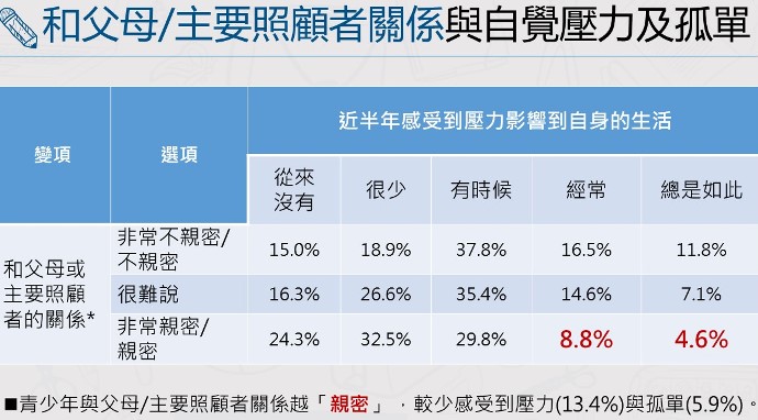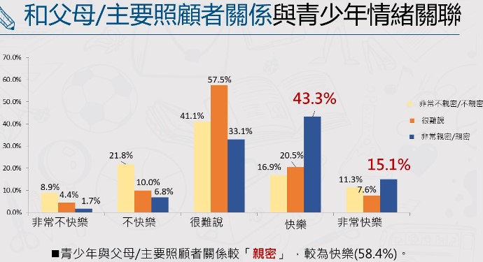 從研究中也發現,青少年與父母親或主要照顧者關係越親密,快樂程度越高(58.4%),壓力越低(13.4%)與孤單程度越低(5.9%)。